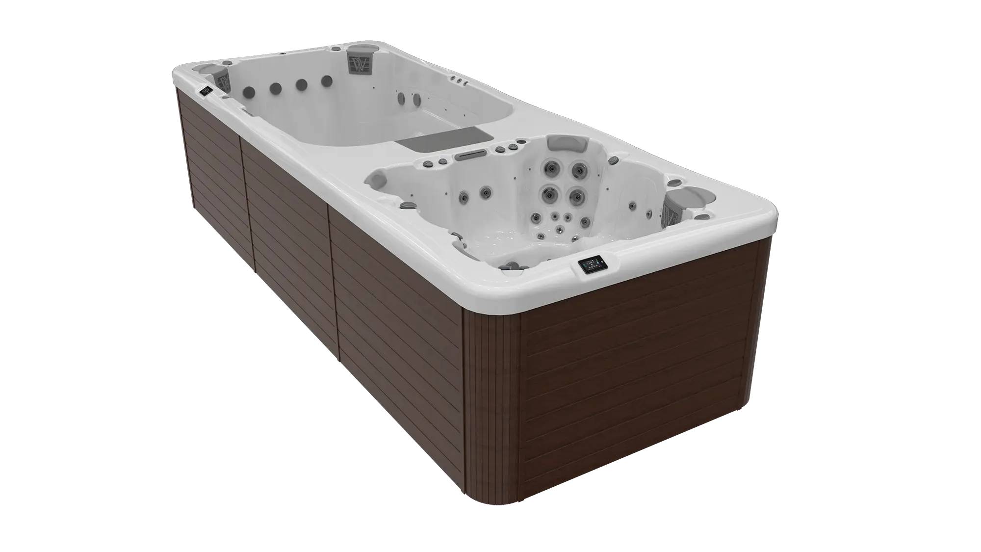 Unsere neuen Rio Grande-Swim spa sind das Ergebnis eines langen Entwicklungsprozesses. Dieses Modell ist die perfekte Kombination aus einem gut ausgestatteten Whirlpool und einem Schwimmbad, das als „Fitnessgerät“ für ein komplettes Workout genutzt wird. Das Innendesign des Hydromassagebereichs ist identisch mit der ergonomischen Gestaltung des beliebten Wellis Malaga Whirlpools. Zusätzlich zu den Wasserfontänen-Düsen ist er mit 3 beleuchteten Fontänen ausgestattet, die durch ihre optische Wirkung eine entspannende Atmosphäre schaffen. Die 40 Hydromassagedüsen ermöglichen den Badegästen ein optimales Massageerlebnis, während Feinstfiltereinsätze das Wasser im Whirlpool kristallklar halten. Der Schwimmteil des Swim Spas, der mit einer Gegenstromanlage ausgestattet ist, wurde komplett neu gestaltet. Die innere Breite beträgt fast 2 Meter, die Länge 314 cm.